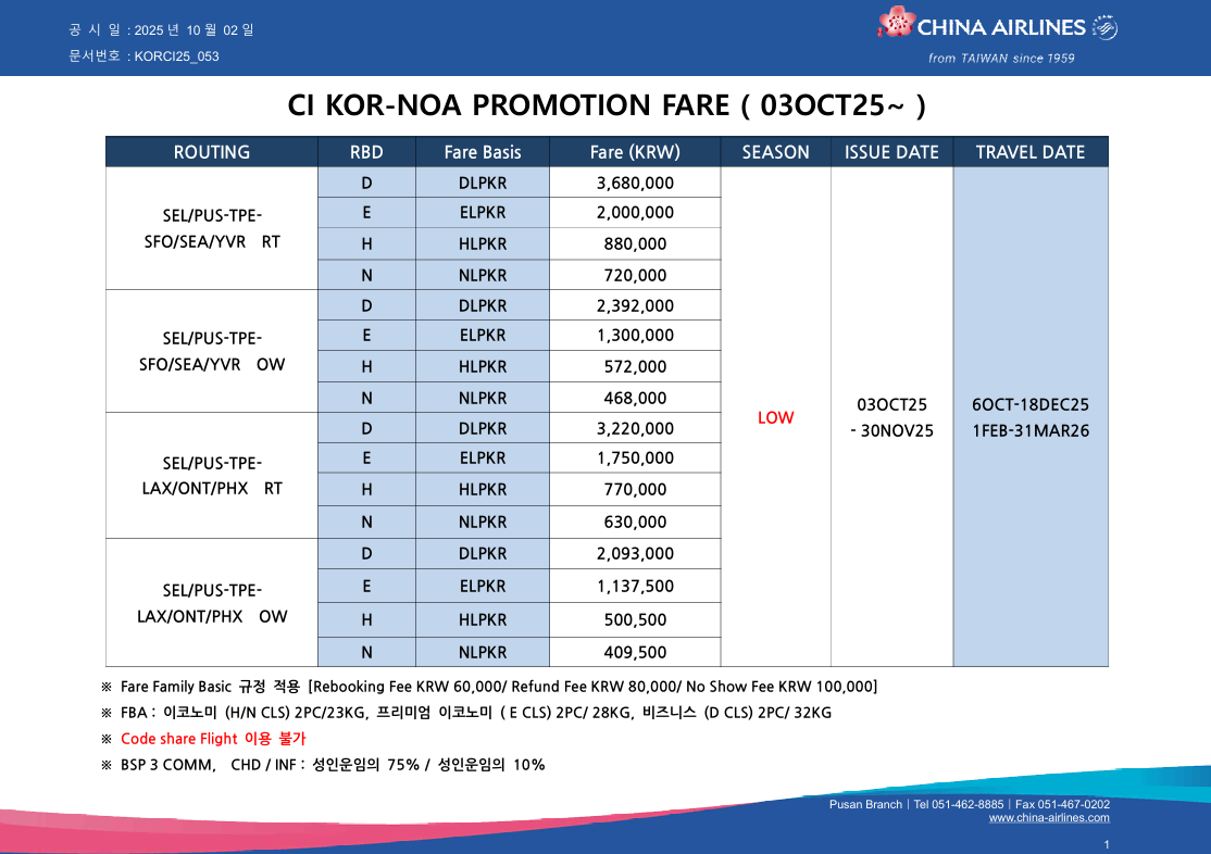 판매가 [특가공지] CI KOR -NOA OW Promotion (03OCT25~)