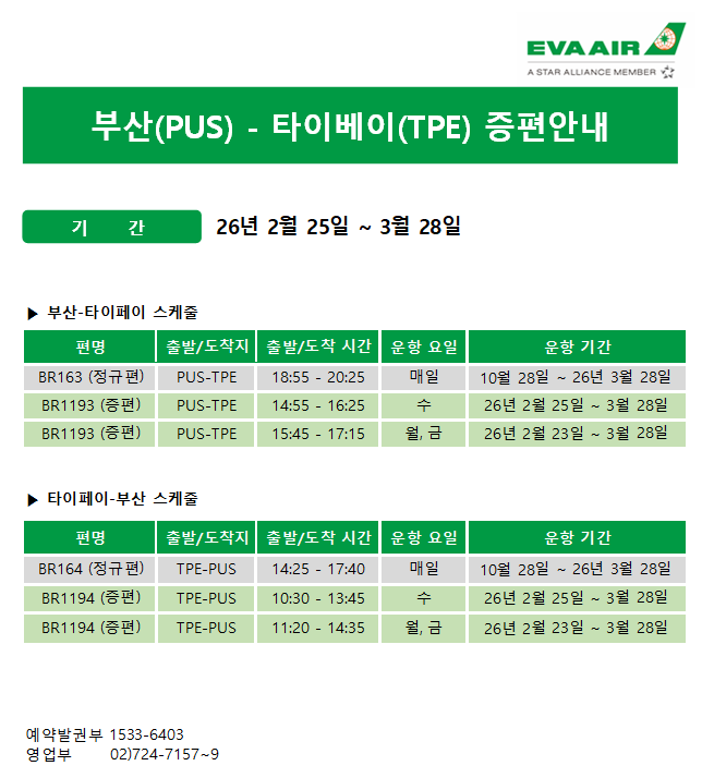 에바항공 부산-타이베이 노선 증편 운항을 안내 드립니다.