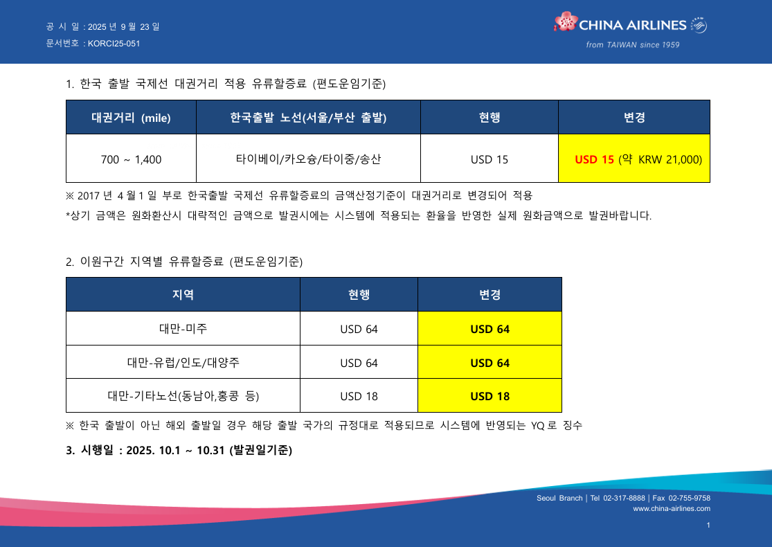 공지사항 중화항공 YQ 안내_ 2025년 10월 1일부터 적용