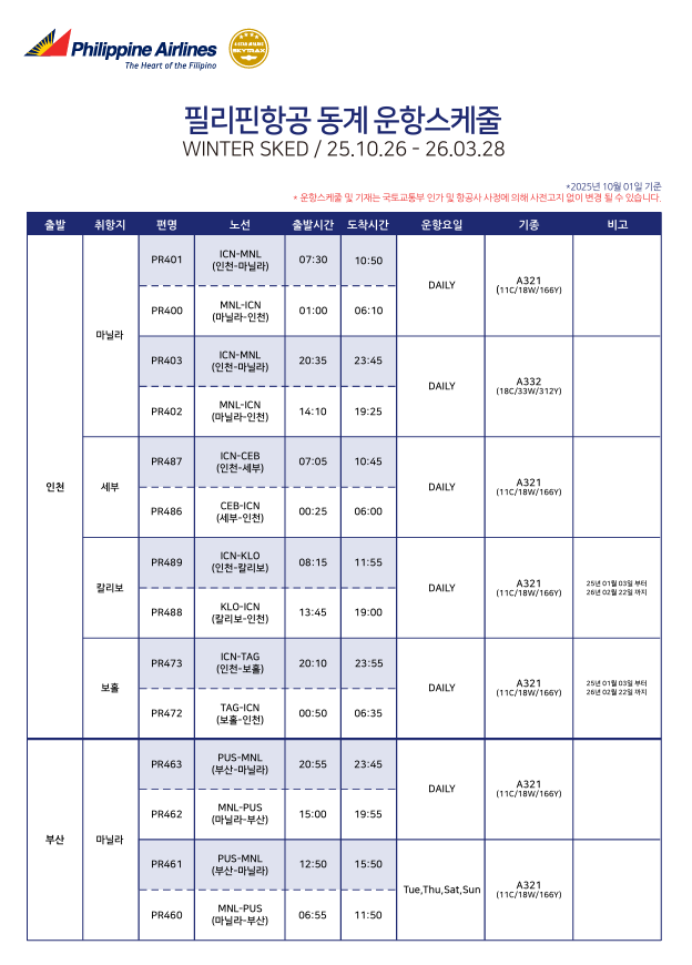 스케줄/운항 [필리핀항공] 동계 운항 스케줄 안내 (25-26년)