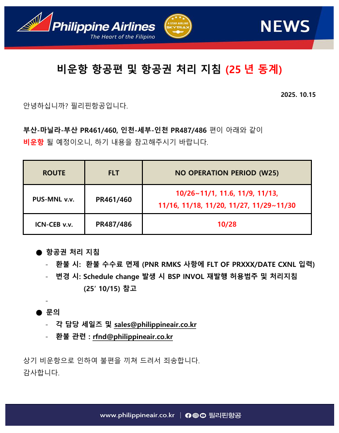 공지사항 [필리핀항공] 비운항 항공편 및 항공권 처리 지침 (25년 동계)